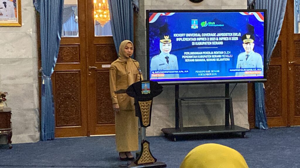 SINDANGHEULA – Kepala Desa Sindangheula, Suheli, S.Kom.I., MM, menghadiri kegiatan Kickoff Universal Coverage Jamsostek (UCJ) Implementasi Inpres 2 Tahun 2021 dan Inpres 8 Tahun 2025 di Pendopo Bupati Serang, Selasa (9/12/2025). Acara tersebut menjadi momentum penting bagi Pemerintah Kabupaten Serang dalam memperluas perlindungan jaminan sosial ketenagakerjaan bagi pekerja rentan di wilayahnya.