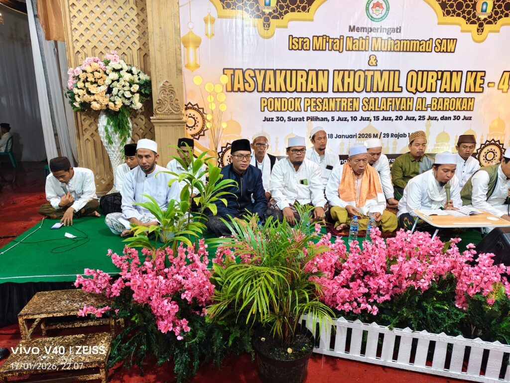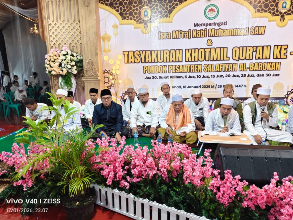 SINDDANGHEULA – Kepala Desa Sindangheula, Suheli, S.Kom.I., M.M. hadir peringatan Isra Mi’raj Nabi Muhammad SAW sekaligus Tasyakuran Khotmil Qur’an ke-4 pada Sabtu malam, 17 Januari 2026 di Pondok Pesantren Salafiyah Al-Barokah Kampung Ranca Sumur, Desa Sindangsari, Kecamatan Pabuaran, Kabupaten Serang. Acara berlangsung khidmat dengan kehadiran sekitar 200 jamaah yang terdiri dari para alim ulama, ustadz, masyarakat Ranca Sumur, santriwan-santriwati, serta