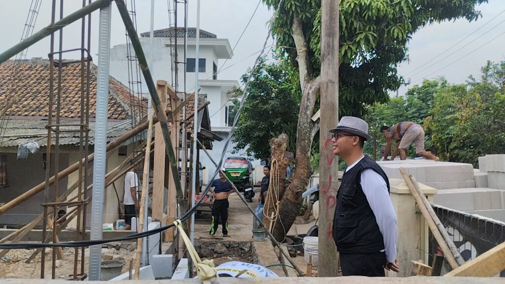 SINDANGHEULA – Kepala Desa Sindangheula Suheli, S.Kom.I.,MM meninjau progres pembangunan program bantuan bedah rumah yang diteria oleh 9 warga Desa